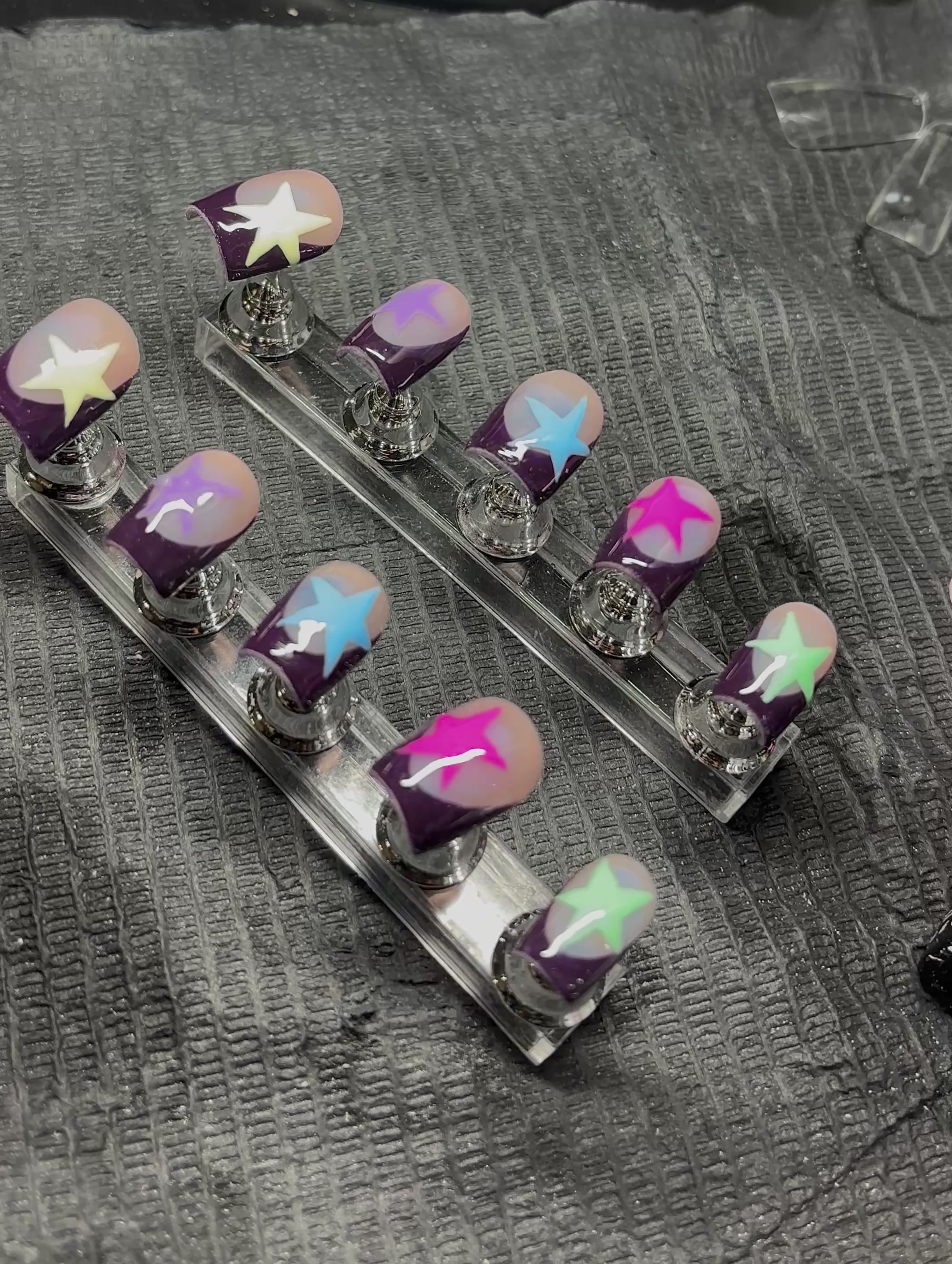 Alluring stars with classic black French tip. A great way to spunk up your outfits. Nails come in all shapes and lengths. This nail set is square and short in length.